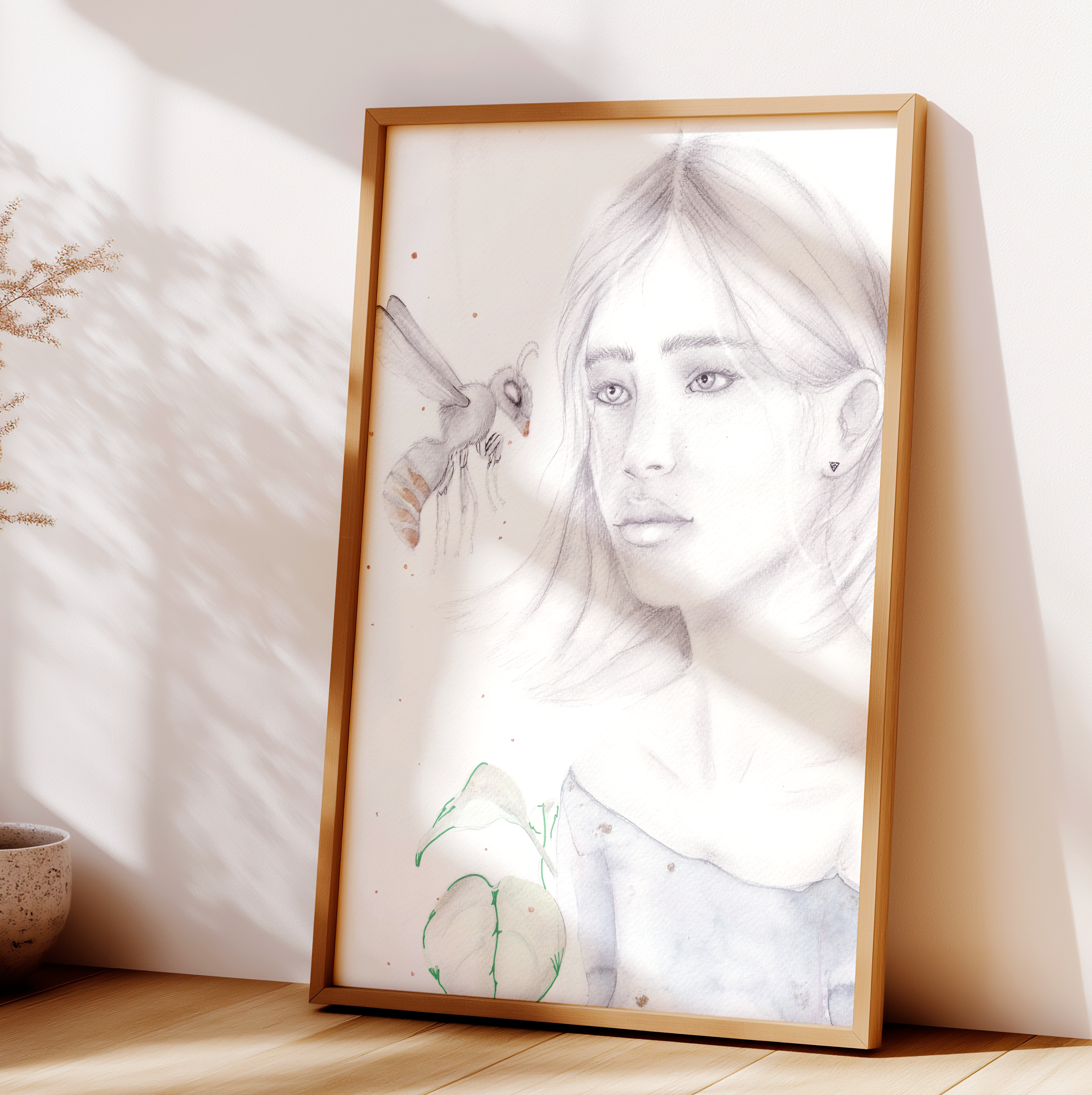 Una escena íntima entre una figura femenina y una avispa, creada como ejercicio personal de técnica y atmósfera.