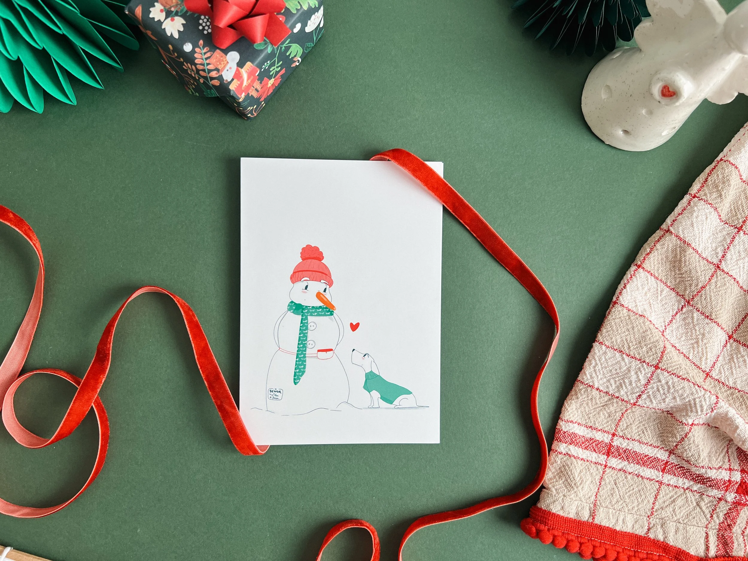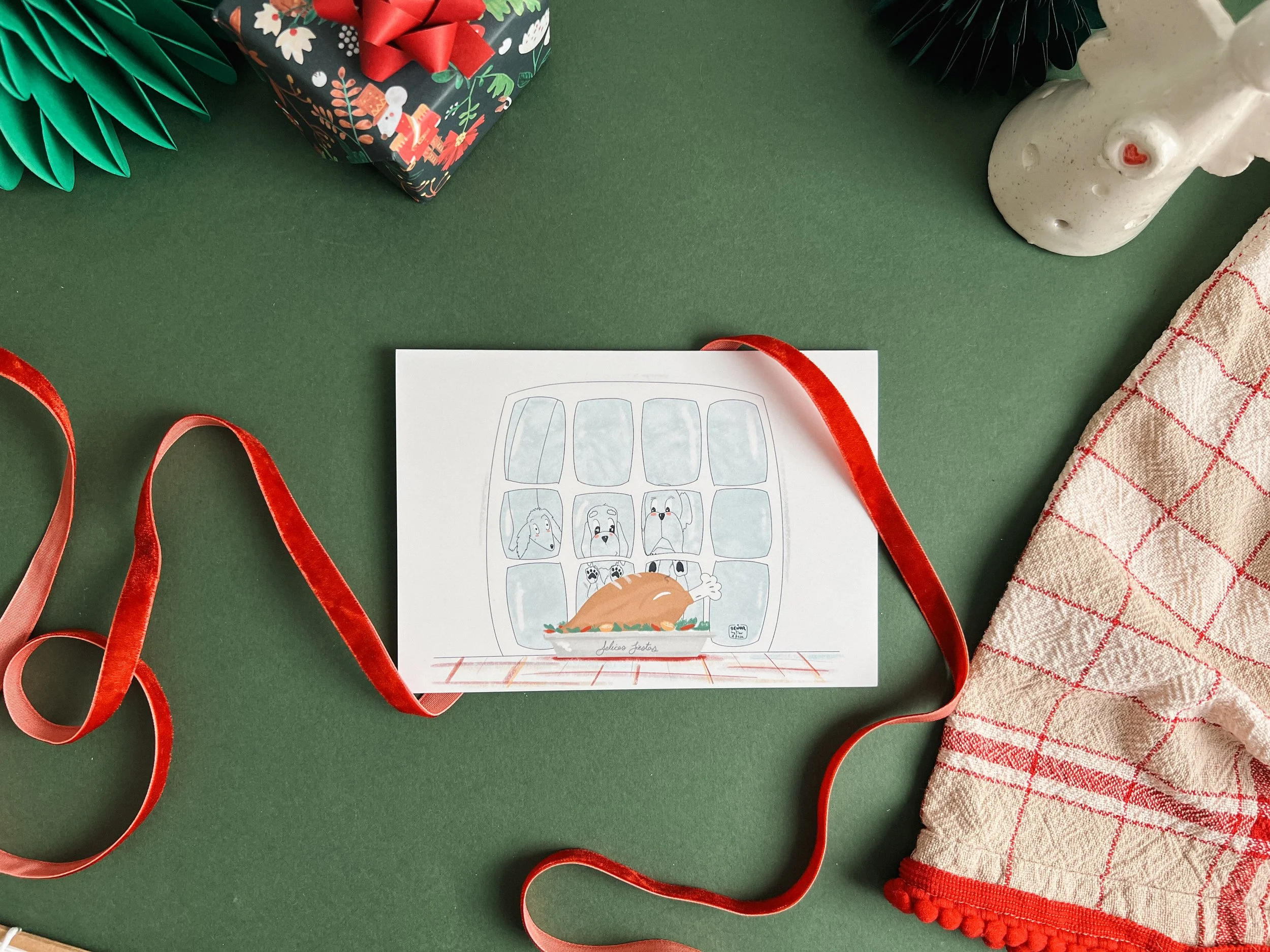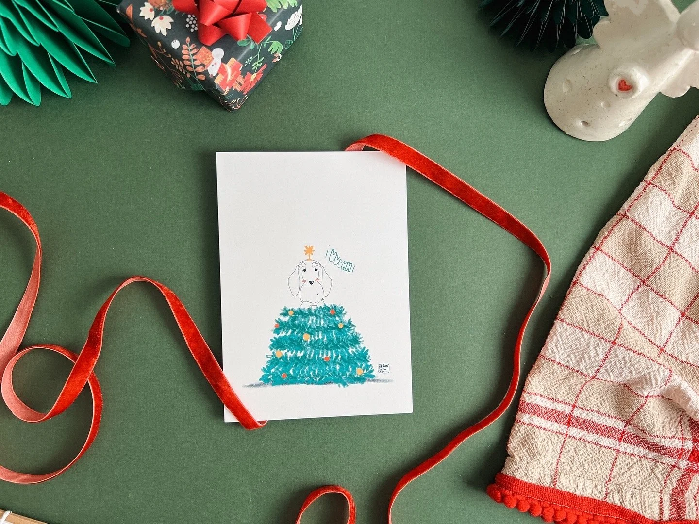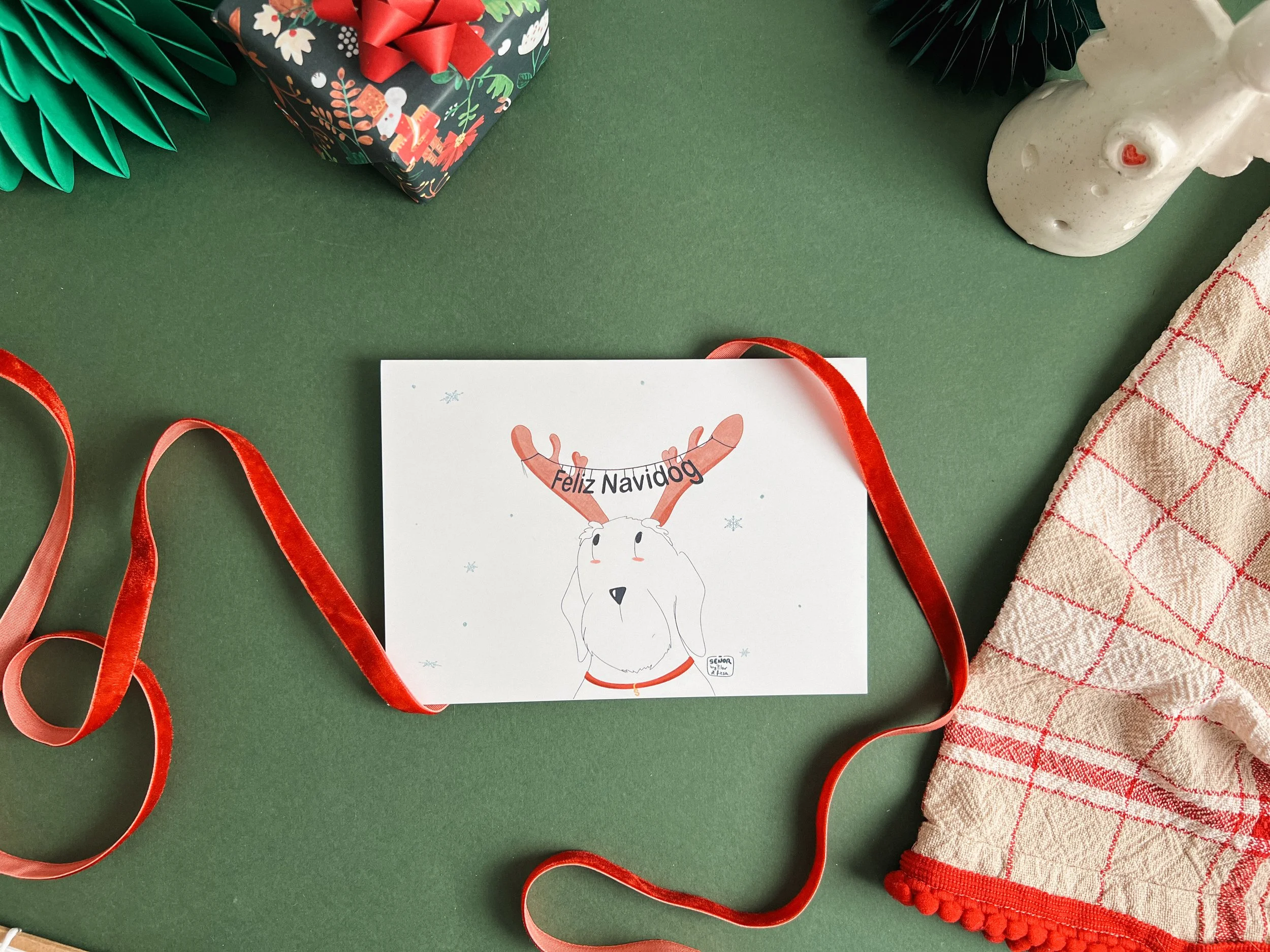 El pack incluye 5 postales de teckels, impresas en papel de 300g, ideales para escribir dentro. También viene con un sobre de papel kraft de 130g.